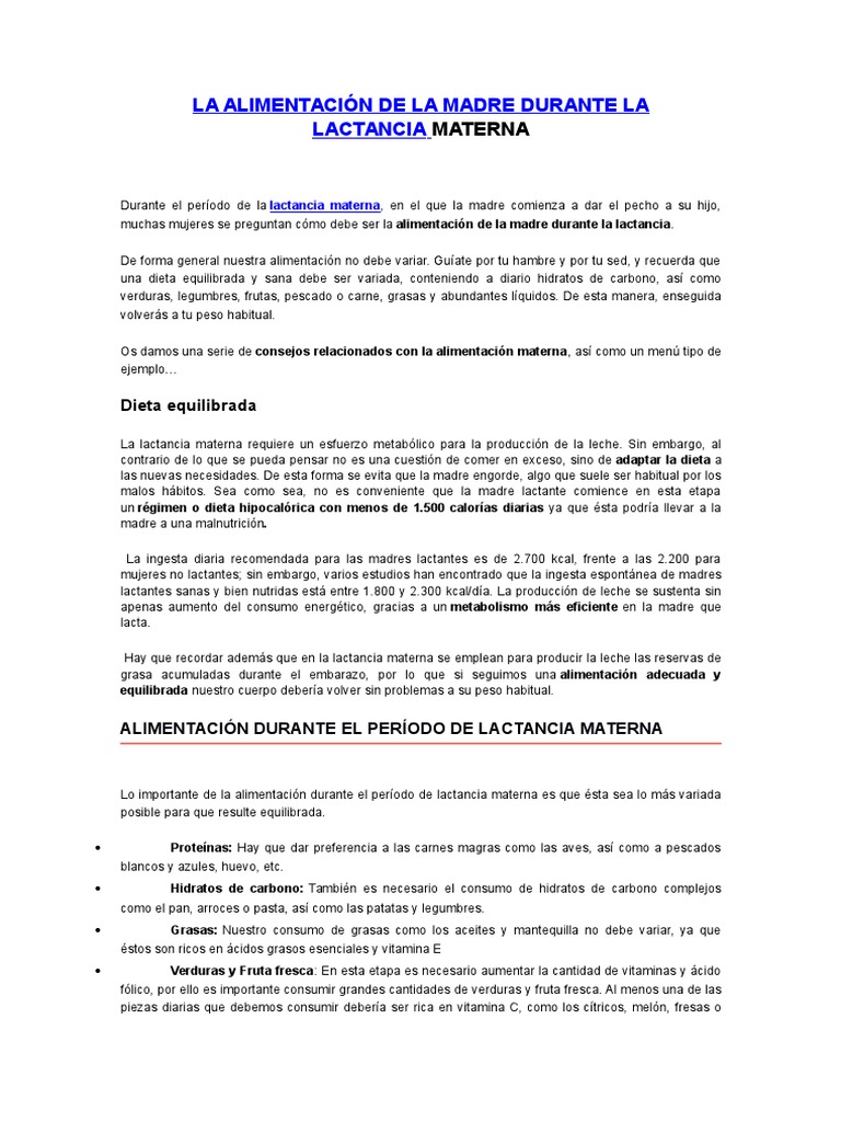 MUJERES EN LACTANCIA: Alimentación en la madre durante la lactancia