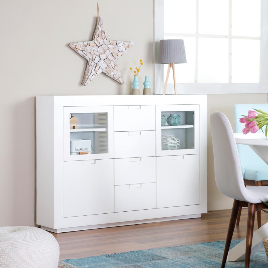 Aparador de comedor blanco con puertas, cajones y estantería